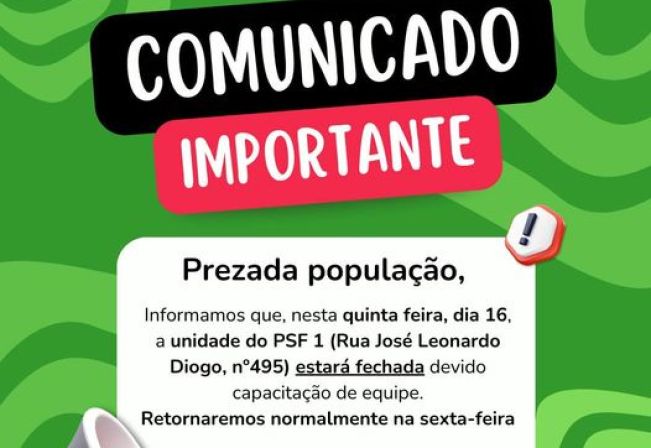 º Informamos que, nesta quinta-feira,dia 16, a unidade do PSF 1( Rua José Leonardo Diogo, nº 495) estará fechada devido capacitação de equipe.