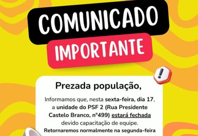 º Informamos que, nesta sexta-feira,dia 17, a unidade do PSF 2( Rua Presidente Castelo Branco, nº 499) estará fechada devido capacitação de equipe.